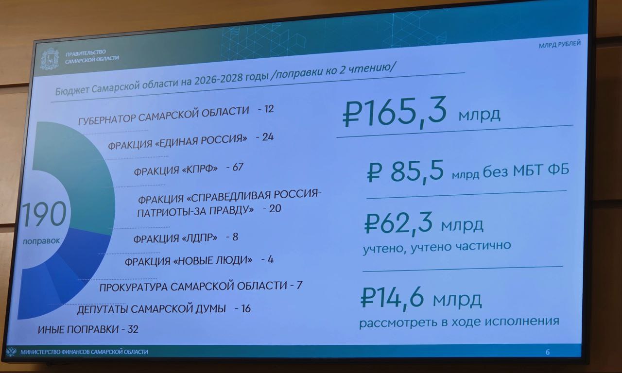 Всего к проекту бюджета на 2026-2028гг. было подано 287 поправок, в том числе из 15-ти муниципалитетов области, 80 поправок было отозвано заявителями. Из оставшихся 207 поправок – 190 финансового (цифрового) значения и 17 текстовых. Общая сумма поправок на трёхлетний период – 165, 3 млрд рублей, из них 2026 год – 76,3 млрд рублей. Из 190 поправок учтены 83, отклонены 36, остальные – приняты к исполнению, т.е. находятся "листе ожидания" и будут учтены при перераспределении доходов и поступлении федеральных средств.