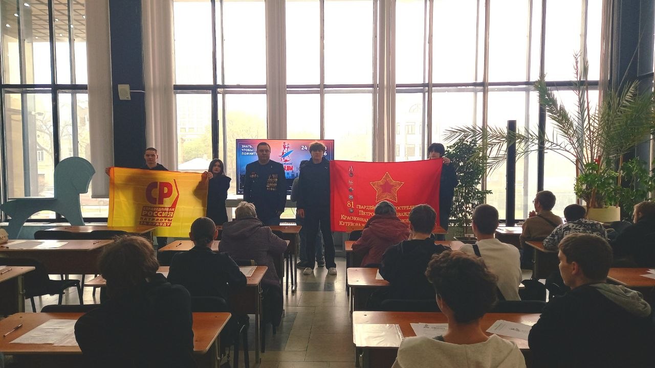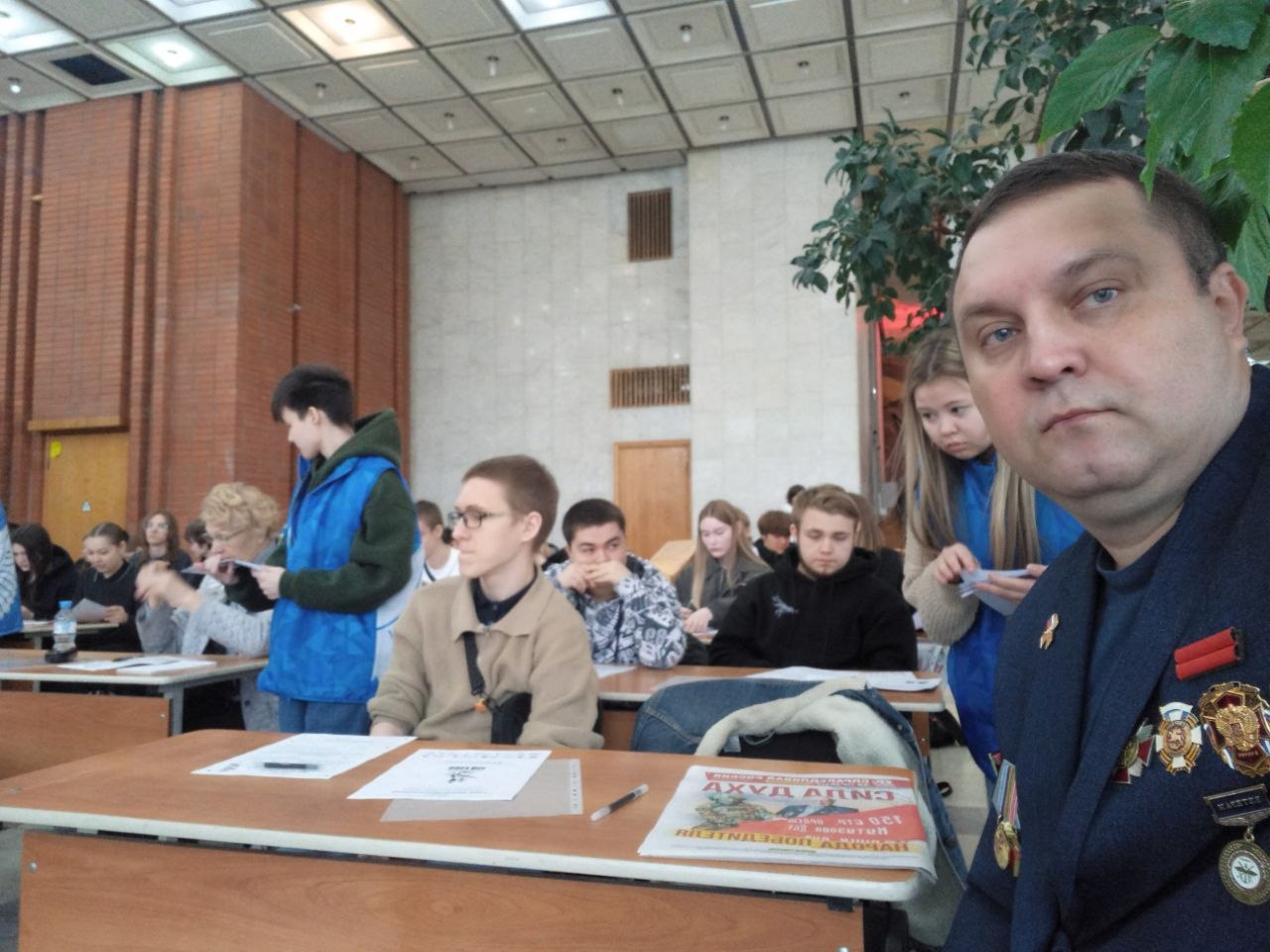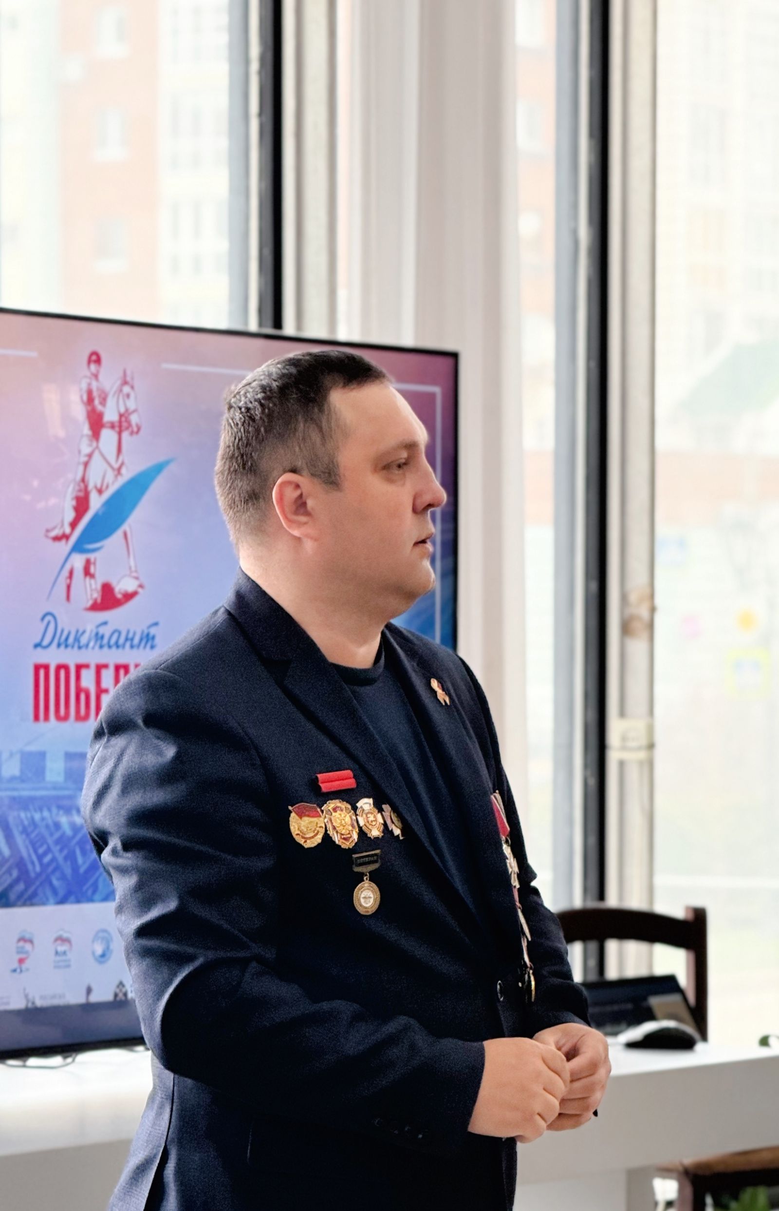 Роман Владимирович Осин, член Совета ветеранов Самарского регионального отделения Партии СПРАВЕДЛИВАЯ РОССИЯ, гвардии сержант 81-го мотострелкового полка, кавалер ордена Мужества, ветеран боевых открыл «Диктант Победы» на площадке Музея имени Алабина (г.Самара).